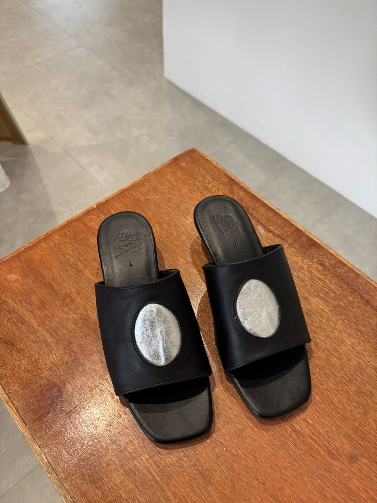 FULL GRAIN BLACK & SILVER LEATHER. 2-INCH SPHERE HEELS. BLACK PADDED INSOLE. CRAFTED IN THE PHILIPPINES.